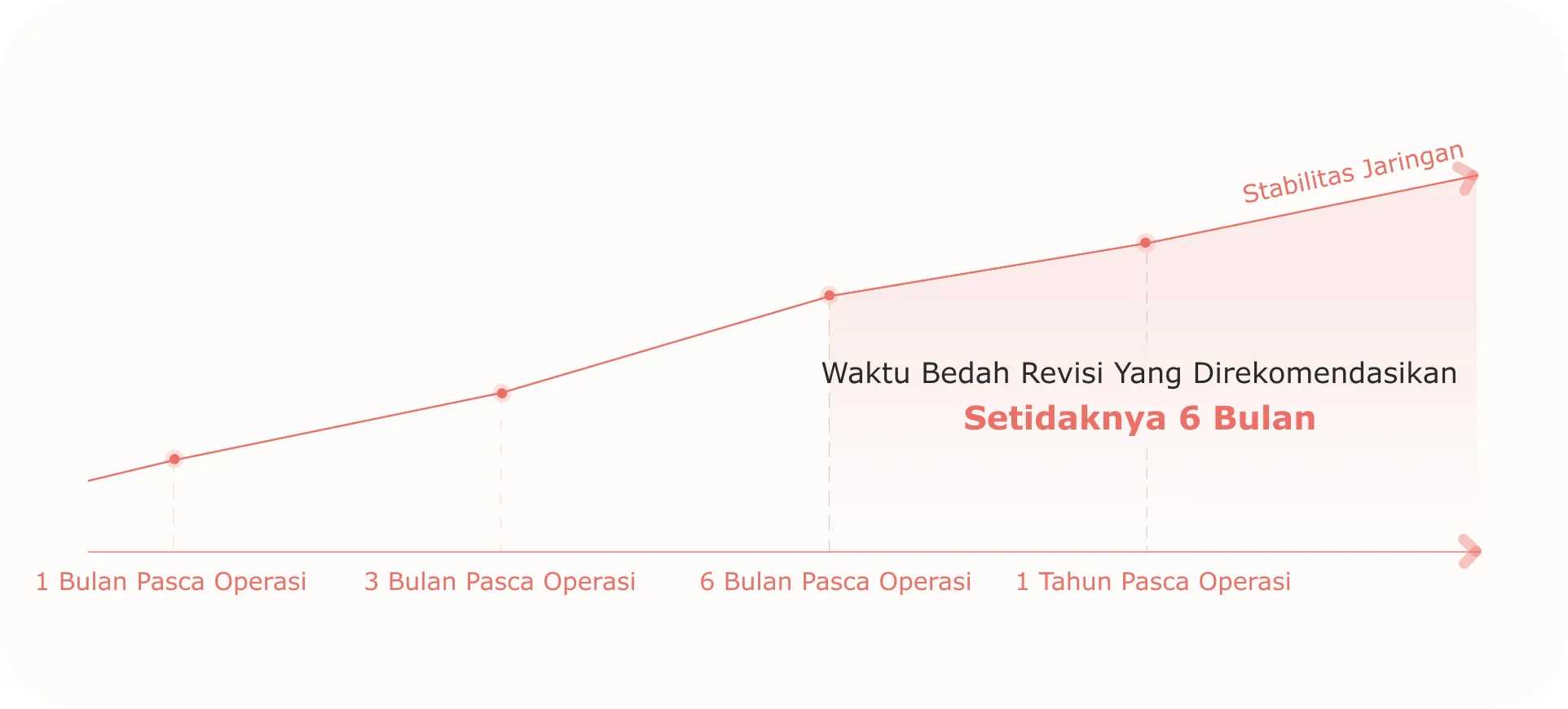 Kami merekomendasikan untuk menjalani revisi payudara setidaknya 6 bulan sesudah operasi awal.