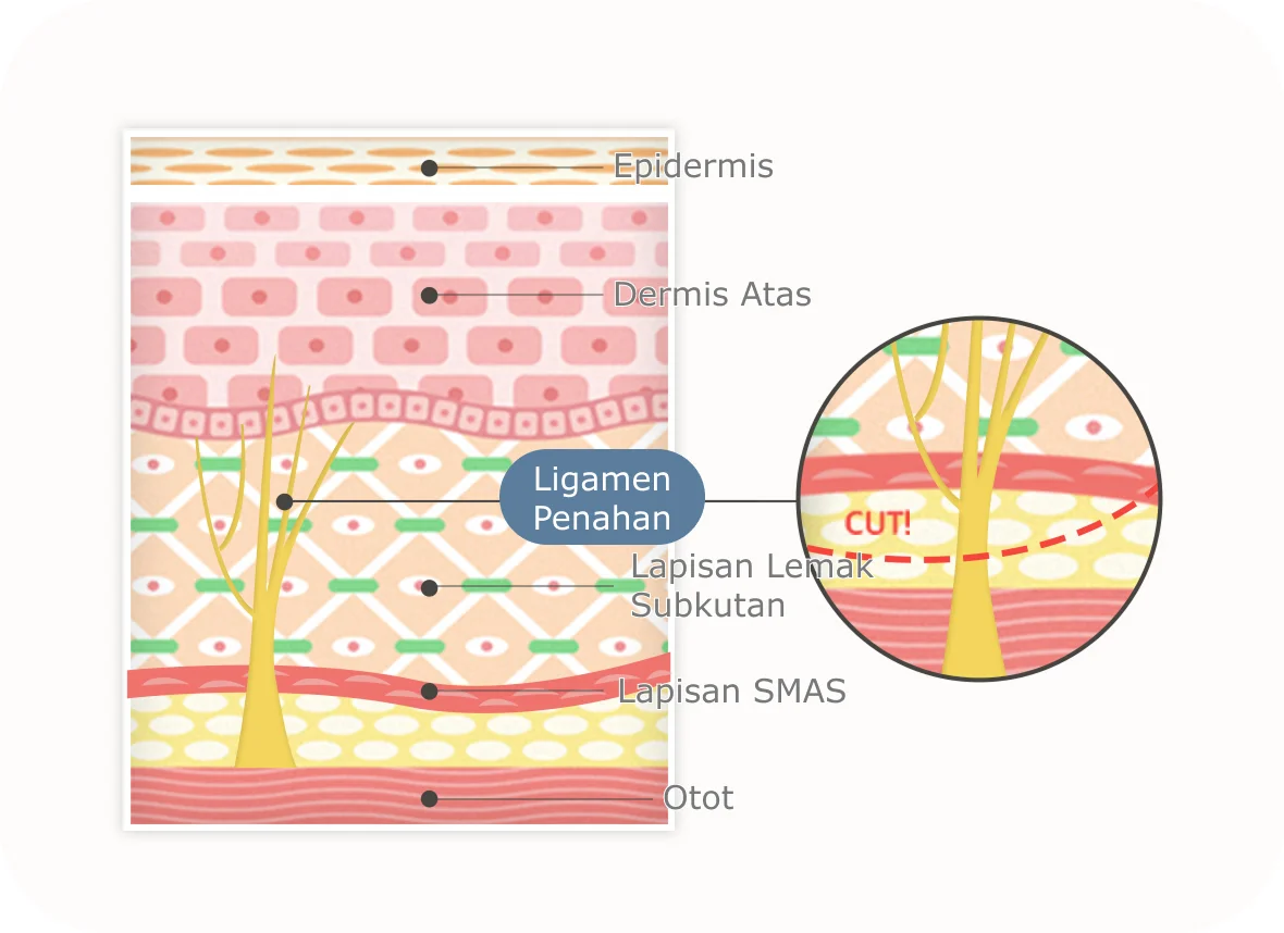 Pengangkatan 4 Langkah 345 menargetkan jauh ke dalam hingga ke ligamen penahan di bawah lapisan SMAS